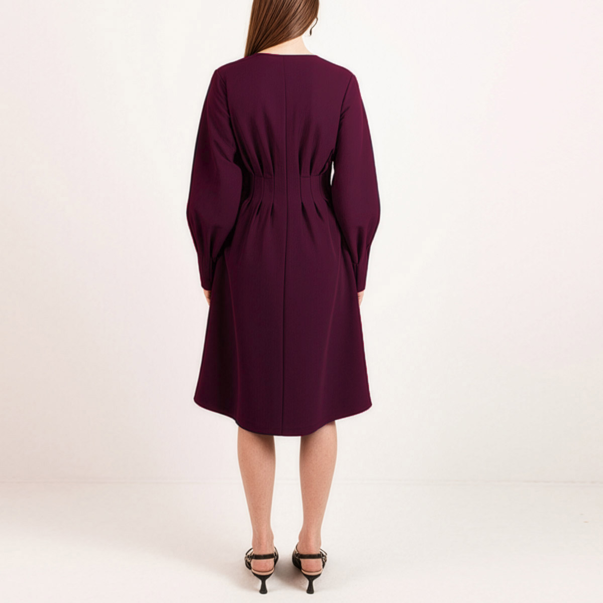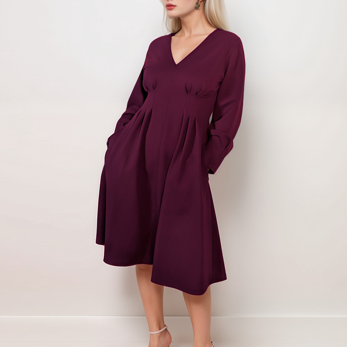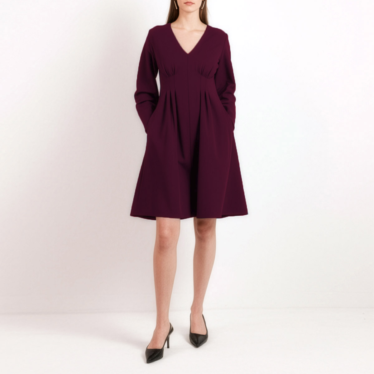 The dress features a deep V-neckline that lengthens the upper body. Below the bust, delicate pleats add volume while keeping the waist defined. Long sleeves and a knee-length hem make it perfect for all seasons. Because of the rich burgundy shade, the look feels bold yet timeless.