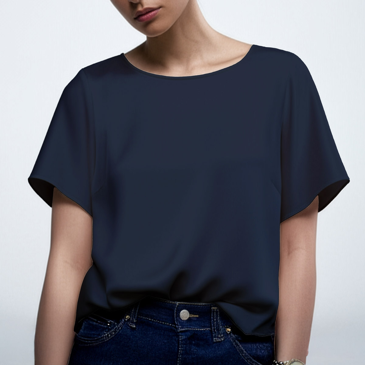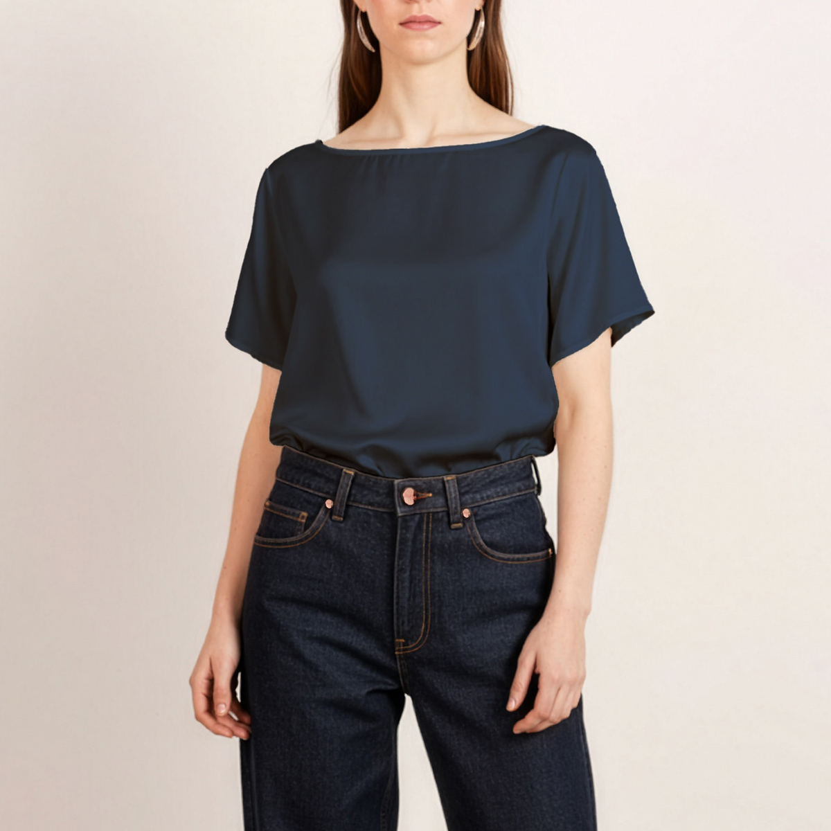 From the very first wear, this tee becomes a timeless favourite. Thanks to its wide-cut sleeves and gently rounded neckline, the fit feels airy yet refined. Moreover, the rich navy hue adds depth to your wardrobe, acting as a versatile base for both bold statements and minimal styling.