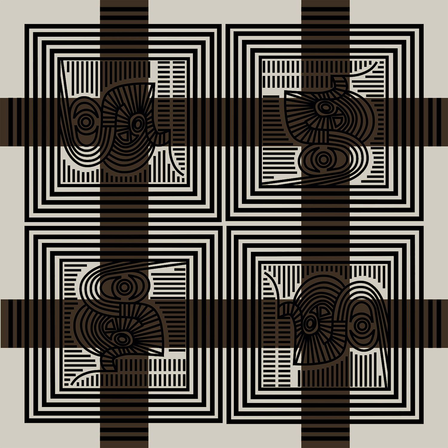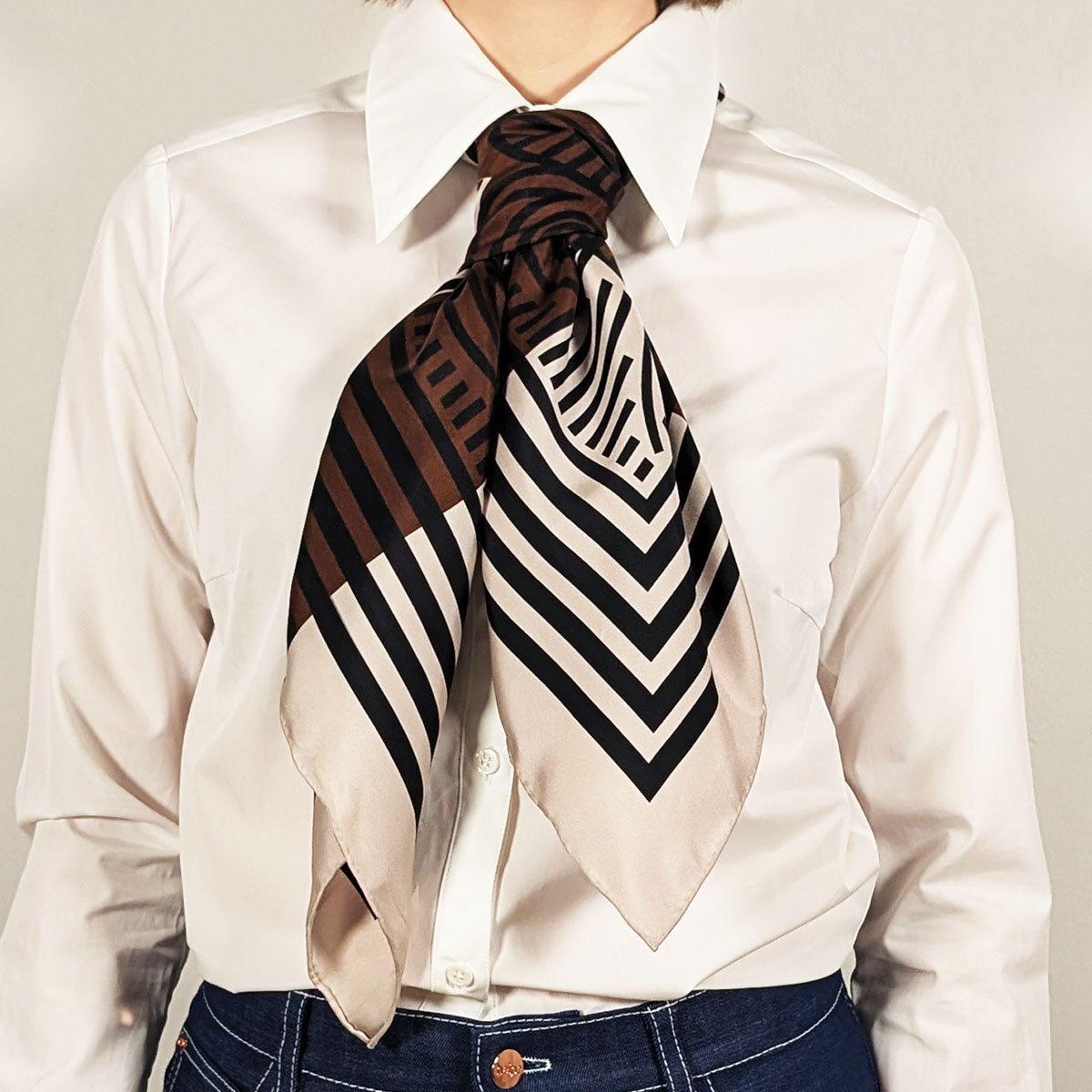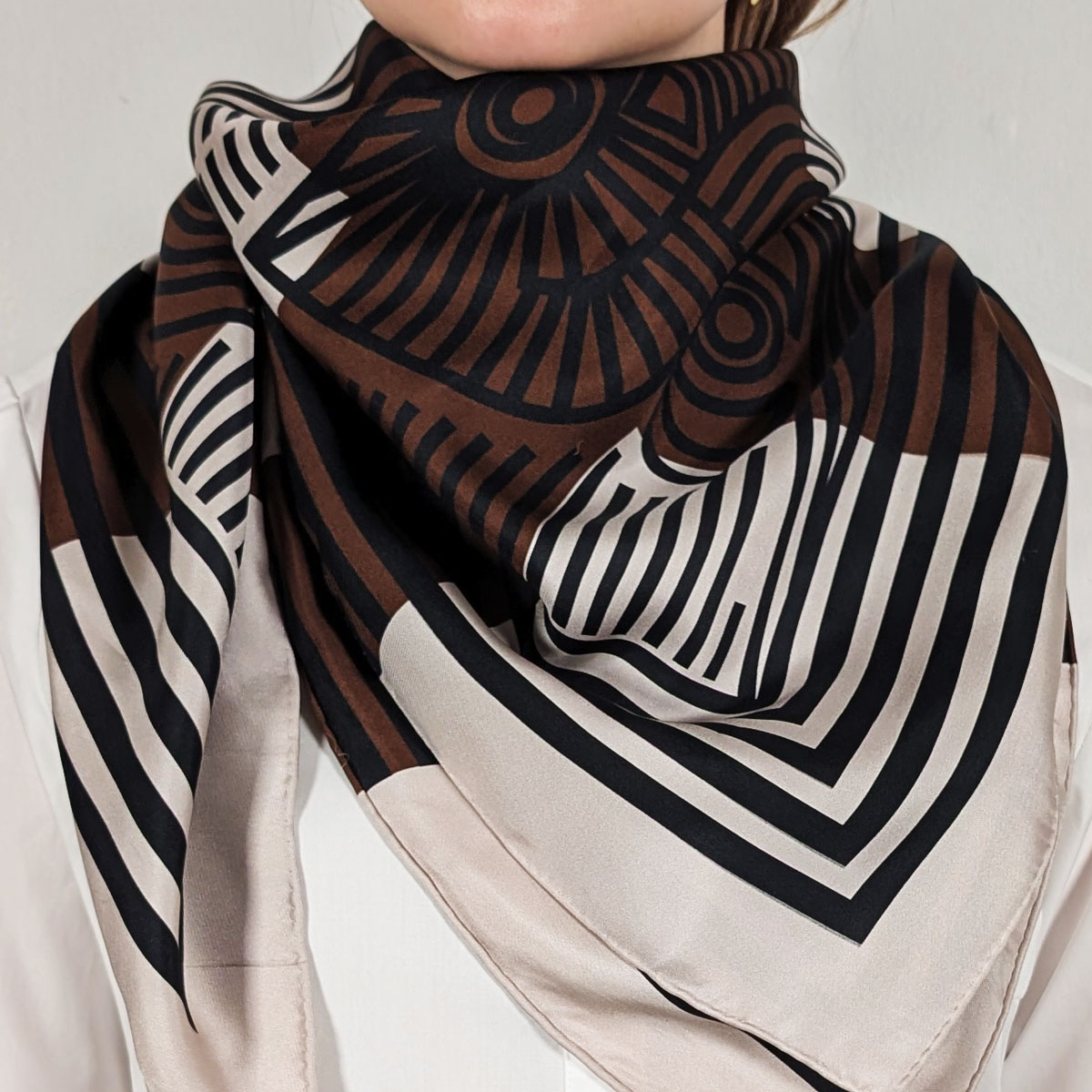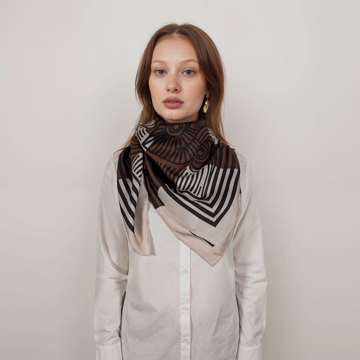 The print plays with contrast. Diagonal stripes frame the scarf, leading the eye toward circular patterns that radiate across the surface. The movement is dynamic, yet the symmetry feels balanced. With rich tones of chocolate brown, cream, and black, the look is both sophisticated and on-trend.