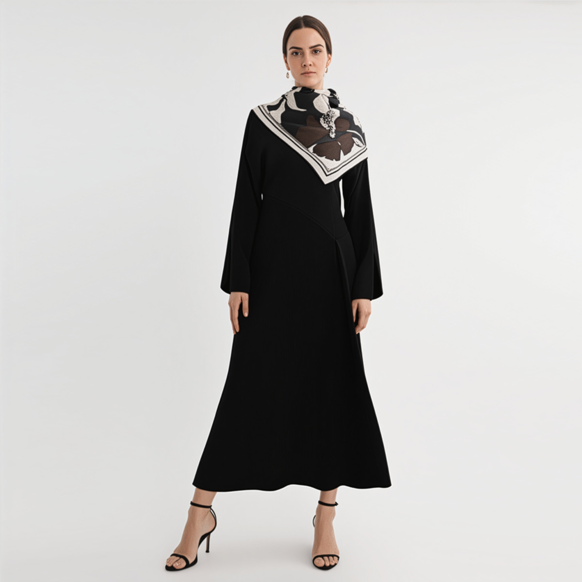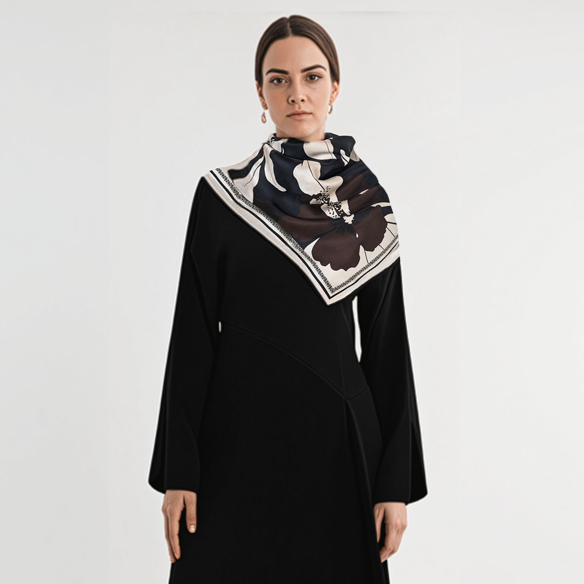 The silk scarf flower brown is a bold yet refined accessory for those who love florals — but want something cooler, sharper, and more unexpected. Designed by Studio Heijne, this 60 x 60 cm silk twill scarf features a large-scale graphic flower in deep brown, soft cream, and crisp black. It’s floral — but with an edge.