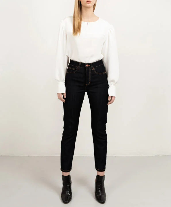 Our denim is carefully developed to become your perfect everyday jeans. It has a straight leg and higher waist than regular jeans. The fit is very flattering; we have especially focused on the curvy parts. Additionally, the denim fabric has a light stretch that makes them extra comfortable.