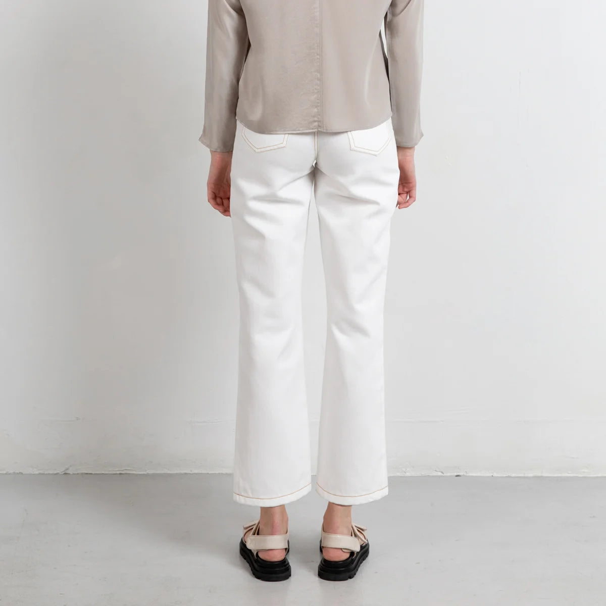 We proudly present our summer-take on jeans with wide legs and a high waist. This version is crafted of a soft yet sturdy cotton/linen/lyocell mix and is 100% natural white. These white summer pants have wide legs, a high waist and fits tightly over the hips and bottom. The pockets lining is designed to have minimun see through effect at the front pocket. The stitchings come in tabacco colour or matching in off-white. (coming soon)