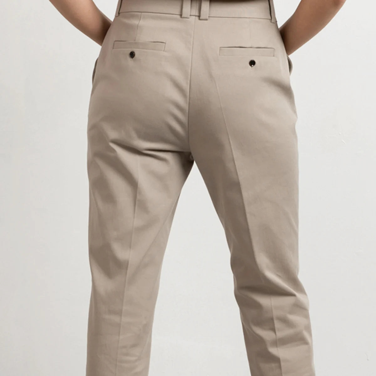 Introducing the perfect cotton-stretch pants with a straight leg and higher waist. The modern shade of greige makes these stretch pants a key-items in your capsule wardrobe. Style the suit pants with white sneakers for a casual approach, or style with heeled ankle boots to prolong your legs. Furthermore, match with a silk blouse for feminine elegance or with a simple tee and sandals during working days.